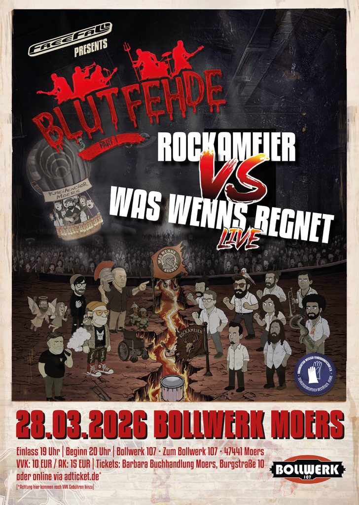Jahrelange Harmonie und Freundschaft? Pfffft. Vergangenheit. Rockameier, Was Wenns Regnet und der Kneipenchor Moers haben auf dem letzten Freefall ihre Liebe an der gemeinsamen Feindschaft entdeckt und machen ihren Boomer-Beef jetzt offiziell. Geklärt wir alles klassisch auf der Blutwiese am “Bollwerk 107”. Am 28.03.2026 gehen die Kontrahenten gemeinsam auf die Bühne und tragen ihre Fehde […]