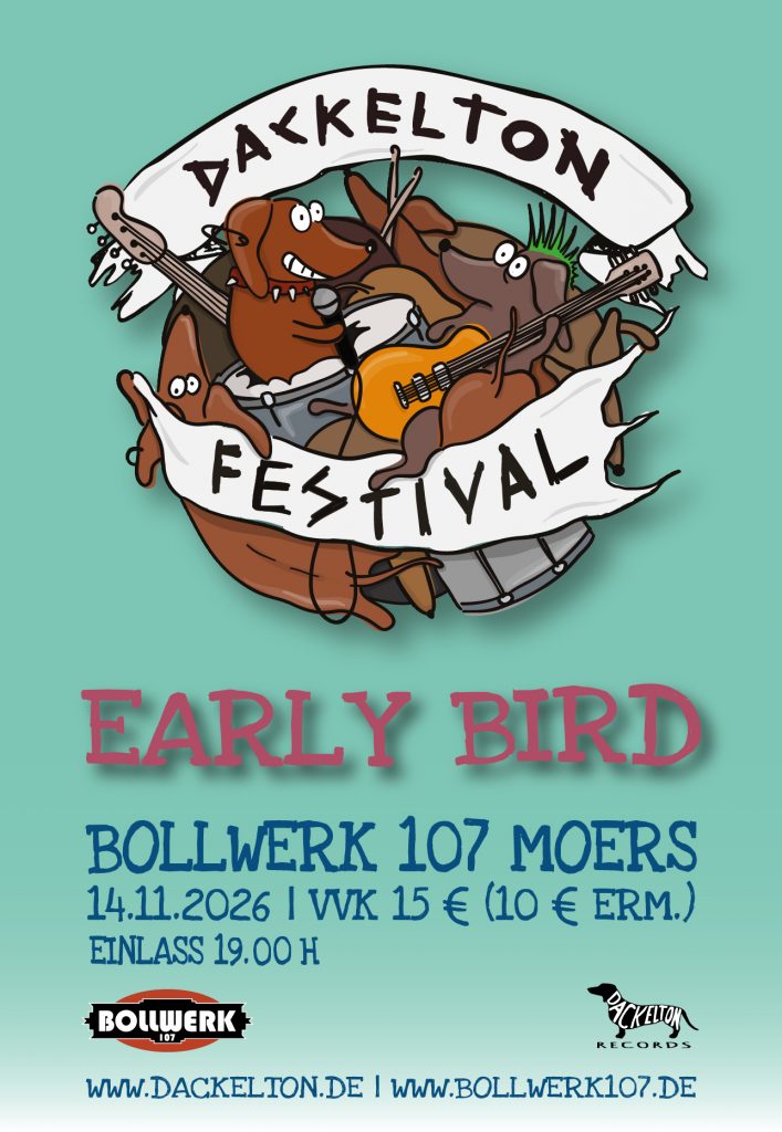 Das Dackelton Festival, ein jährliches Highlight am Niederrhein, kehrt zum wiederholten Male mit einer Menge Spaß im Gepäck im Bollwerk 107 ein und zieht Freunde der gepflegt-punkigen Unterhaltung aus ganz Deutschland nach Moers. Weitere Infos folgen mit Bekanntgabe des Line Ups.